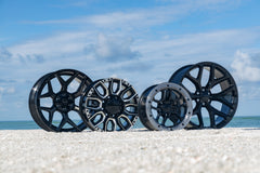Black with Chrome: These wheels start with a black powder coat base, which is then machined for a sleek aluminum appearance. An injection-molded polymer insert is applied and vacuum metallized to achieve a bright chrome finish. The process concludes with two layers of clear coat to enhance protection and shine. |