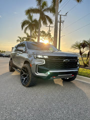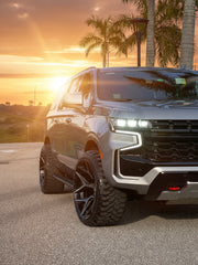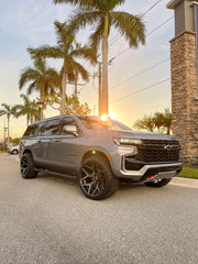 Chevrolet Suburban on our 4P06 in size 24x12 wrapped in 33x12.5x24 @rbptire with stock suspension. Does it rub? Yes, you'll need to either lift the vehicle 2" or more, OR some minimal plastic fender liner trimming required for stock suspension fitment. We also offer these wheels in a 24x10 for a bolt on fitment, no modifications necessary. Contact us for details, in stock NOW!